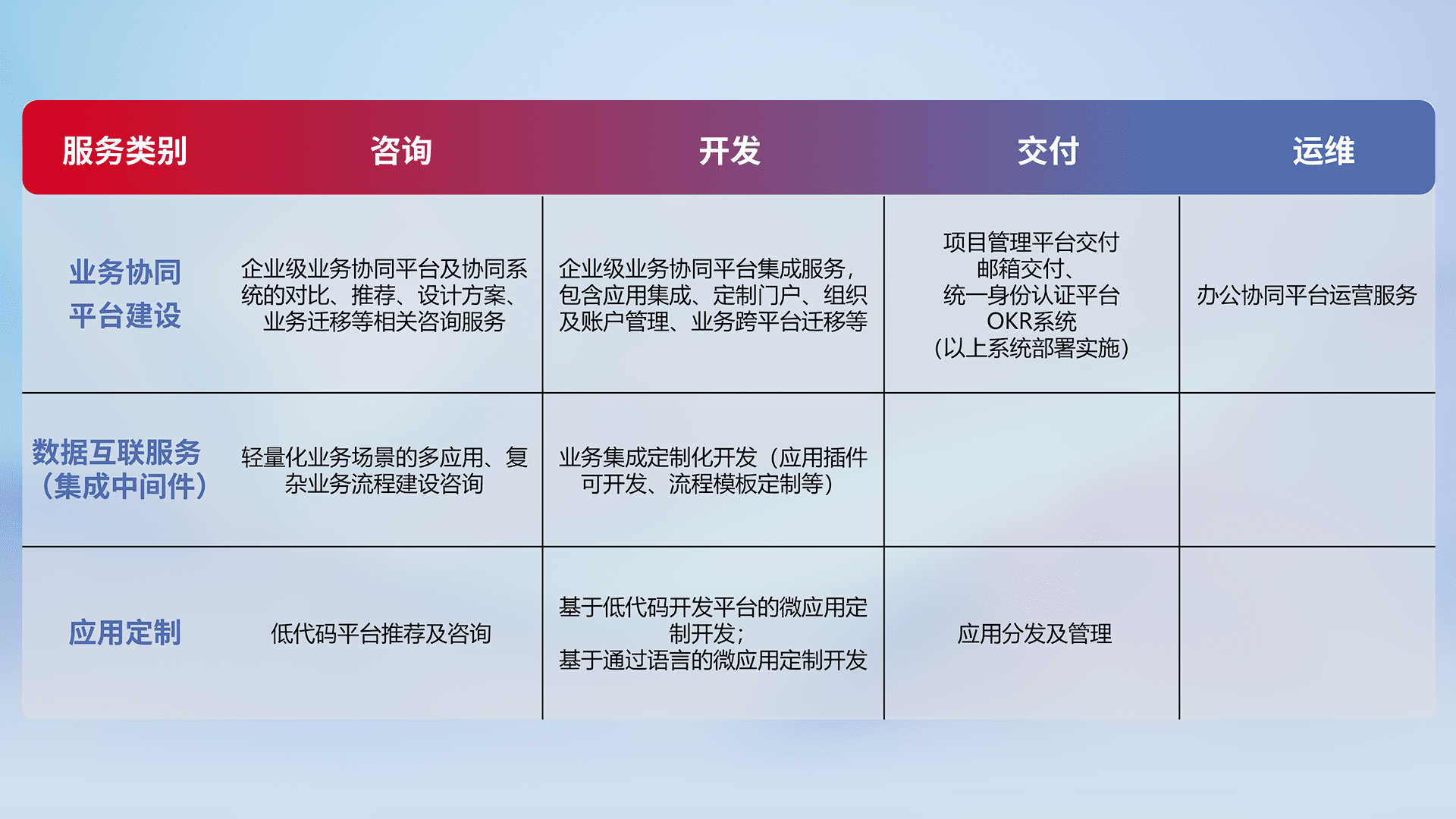 针对钉钉、、、企微、、、、IDaas等平台级产品提供产品的规划、、方案、、交付、、定制化开发等服务,,,,实现如统一协同办公、、、、智能客户服务、、混合会议管理、、智能数据查询、、、等业务场景,,,实现数字化转型。。。