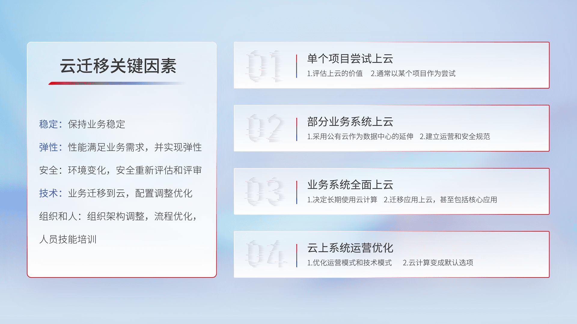 结合实际业务,,,从规划设计、、、、云平台选型、、、云原生改造、、、、数据迁移、、集成交付,,,迁移全过程为客户识别最佳上云路径,,做好风险识别管理,,,,设计网络架构、、、、身份权限、、安全审计合规、、、、操作审计、、日志审计、、监控告警策略、、、多站点容灾设计等,,对云上基础设施进行整体规划,,提升IT治理水平,,以满足弹性、、、高可用、、、高性能的需求。。